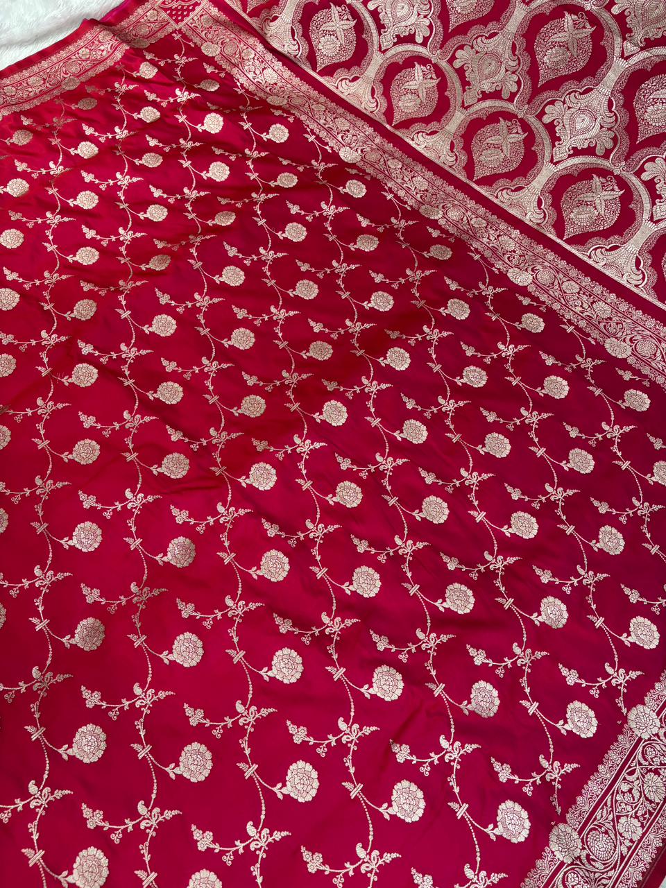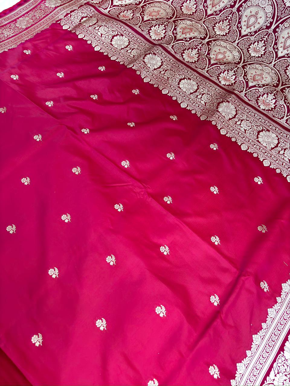 Rani Red Mashru Katan Silk Powerloom Saree with Floral Zari Jaal & Grand Banarasi Pallu
