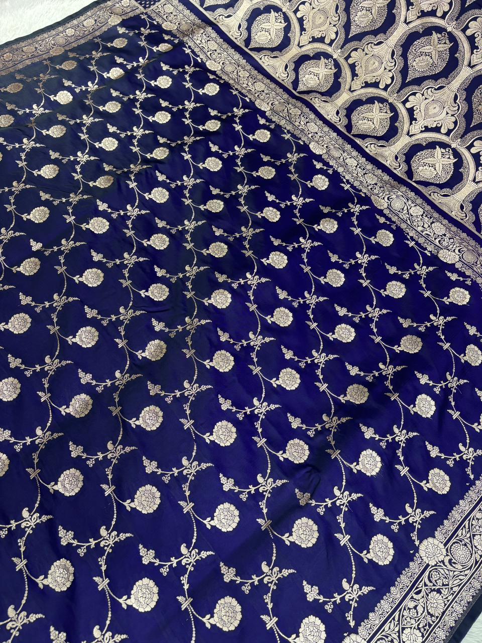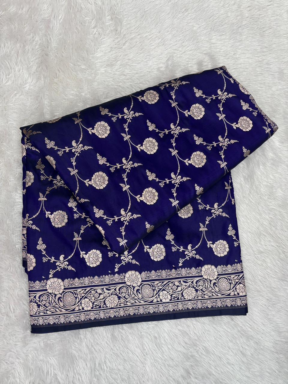 Royal Blue Mashru Katan Silk Powerloom Saree with Floral Zari Jaal & Grand Banarasi Pallu