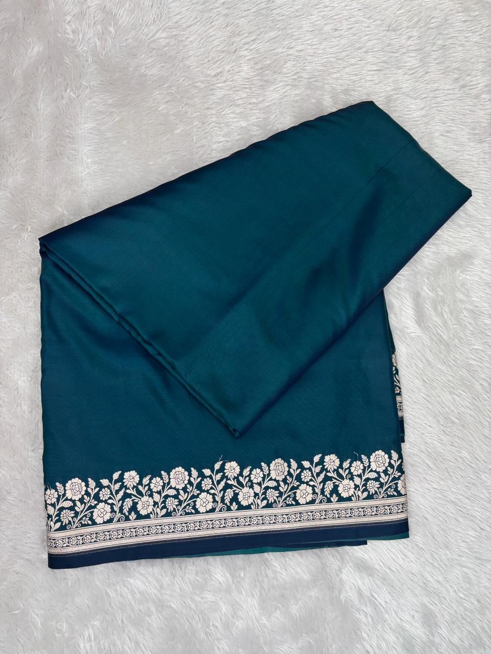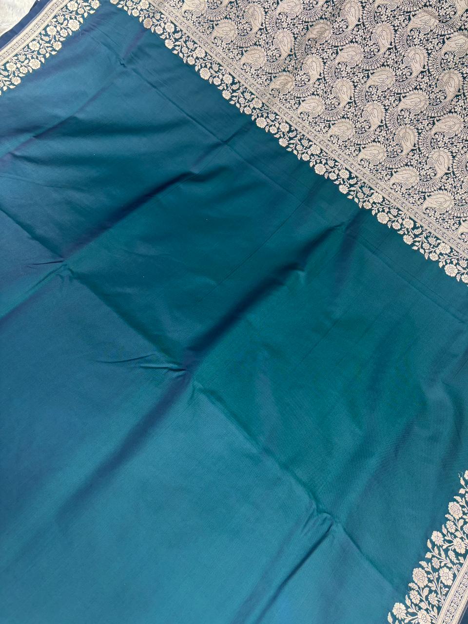 Regal Peacock Teal Mashru Katan Silk Powerloom Saree with Antique Zari Floral Border & Paisley Pallu