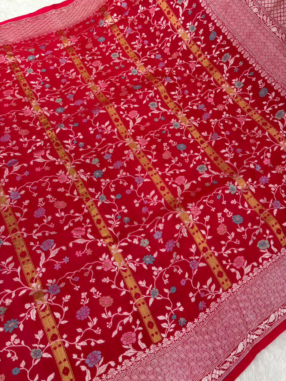 The Textured Symphony: Red Tussar Georgette Handloom Banarasi Saree