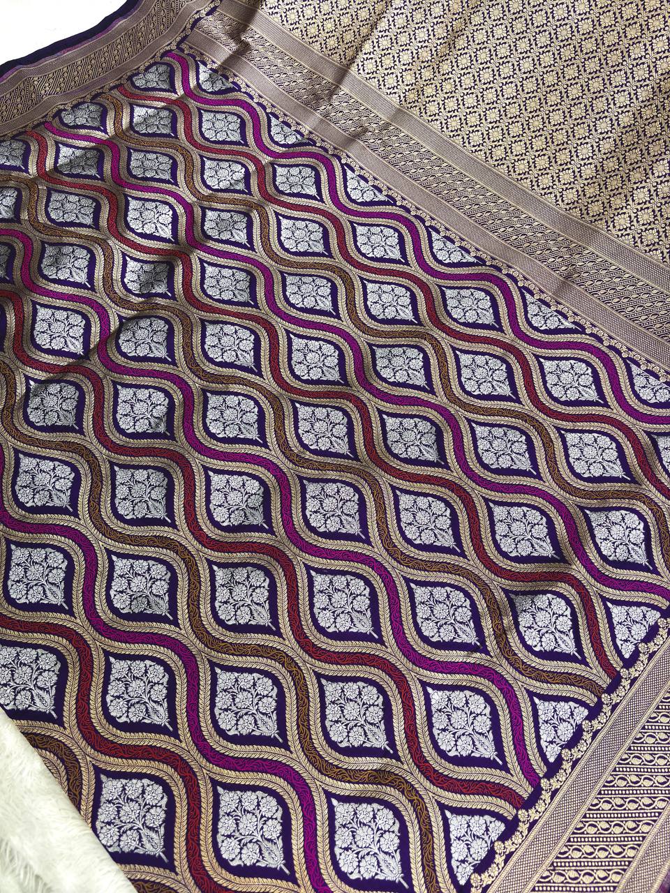 Royal Purple Katan Silk Saree with Silver Zari Ogee Jaal and Magenta Meenakari Waves