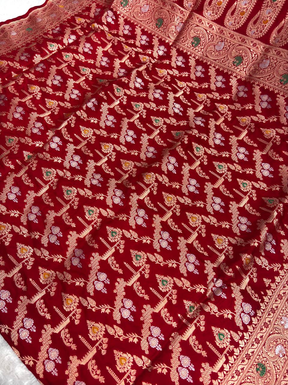 Bridal Scarlet Red Katan Silk Saree with Antique Gold Diagonal Bel and Jewel-Toned Meenakari