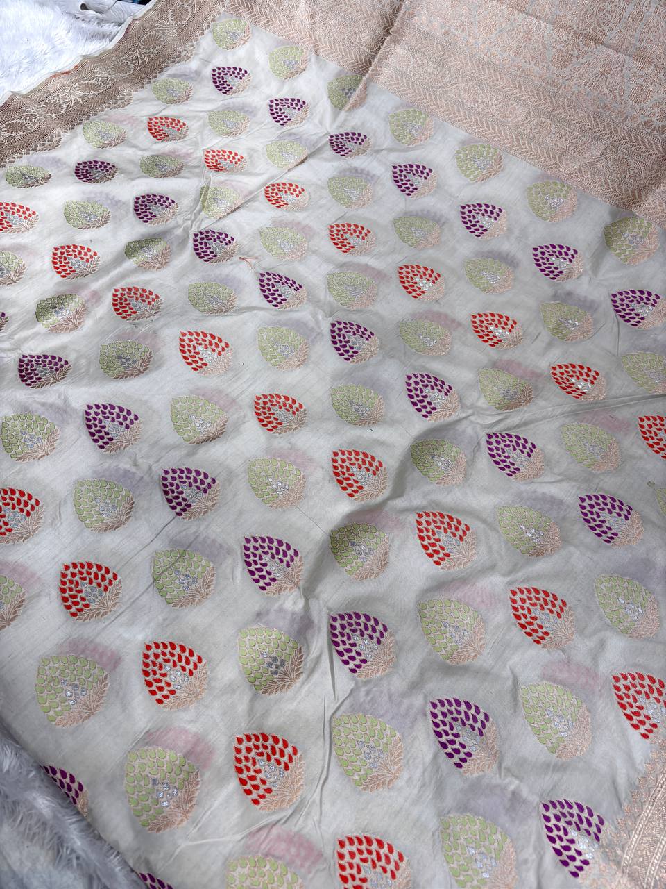 Pearl White Katan Silk Butidar Saree with Copper-Gold Zari and Rainbow Meenakari Teardrops