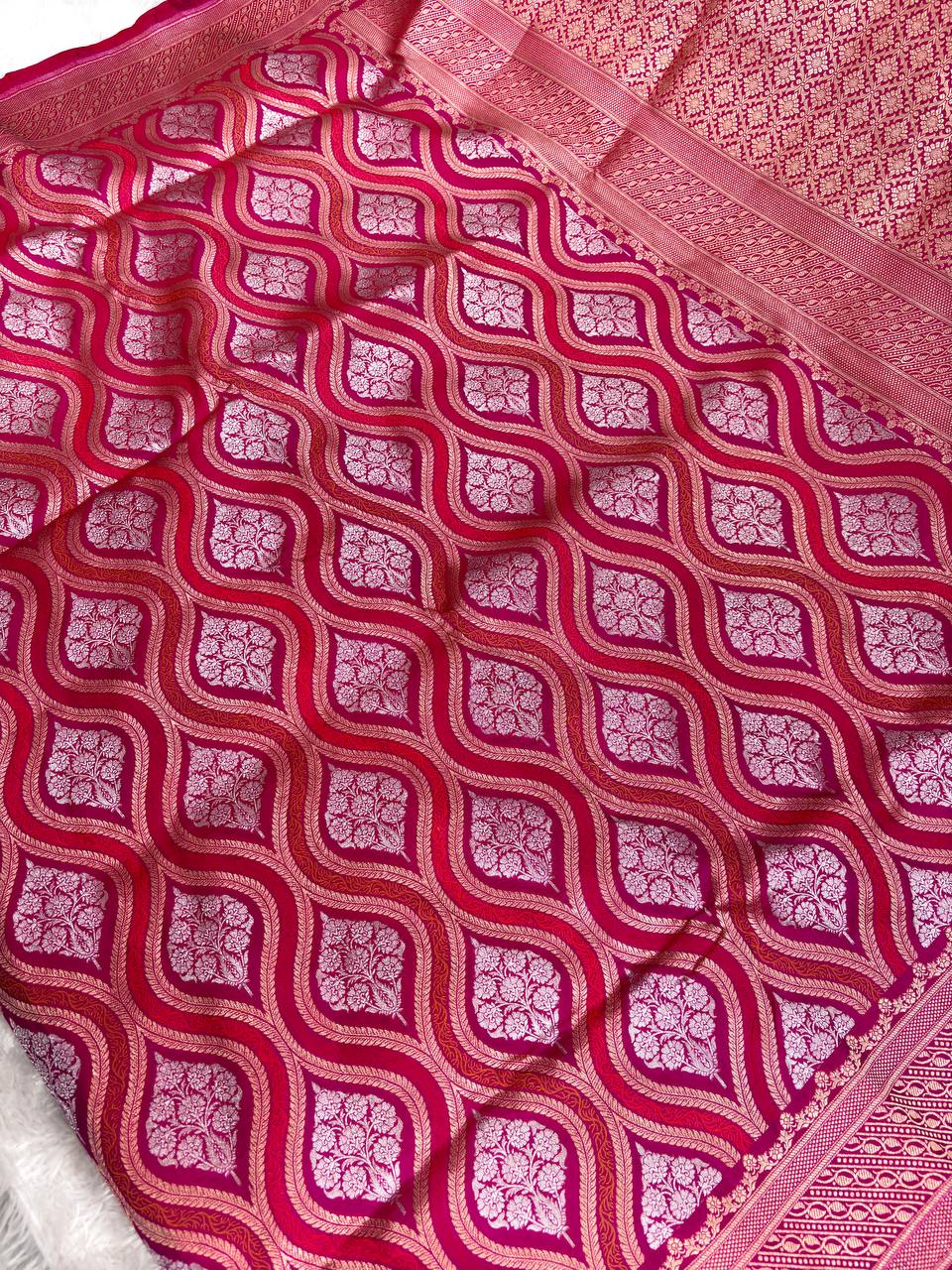 Magenta Red Katan Silk Saree with Silver Zari Ogee Jaal and Traditional Meenakari Florals
