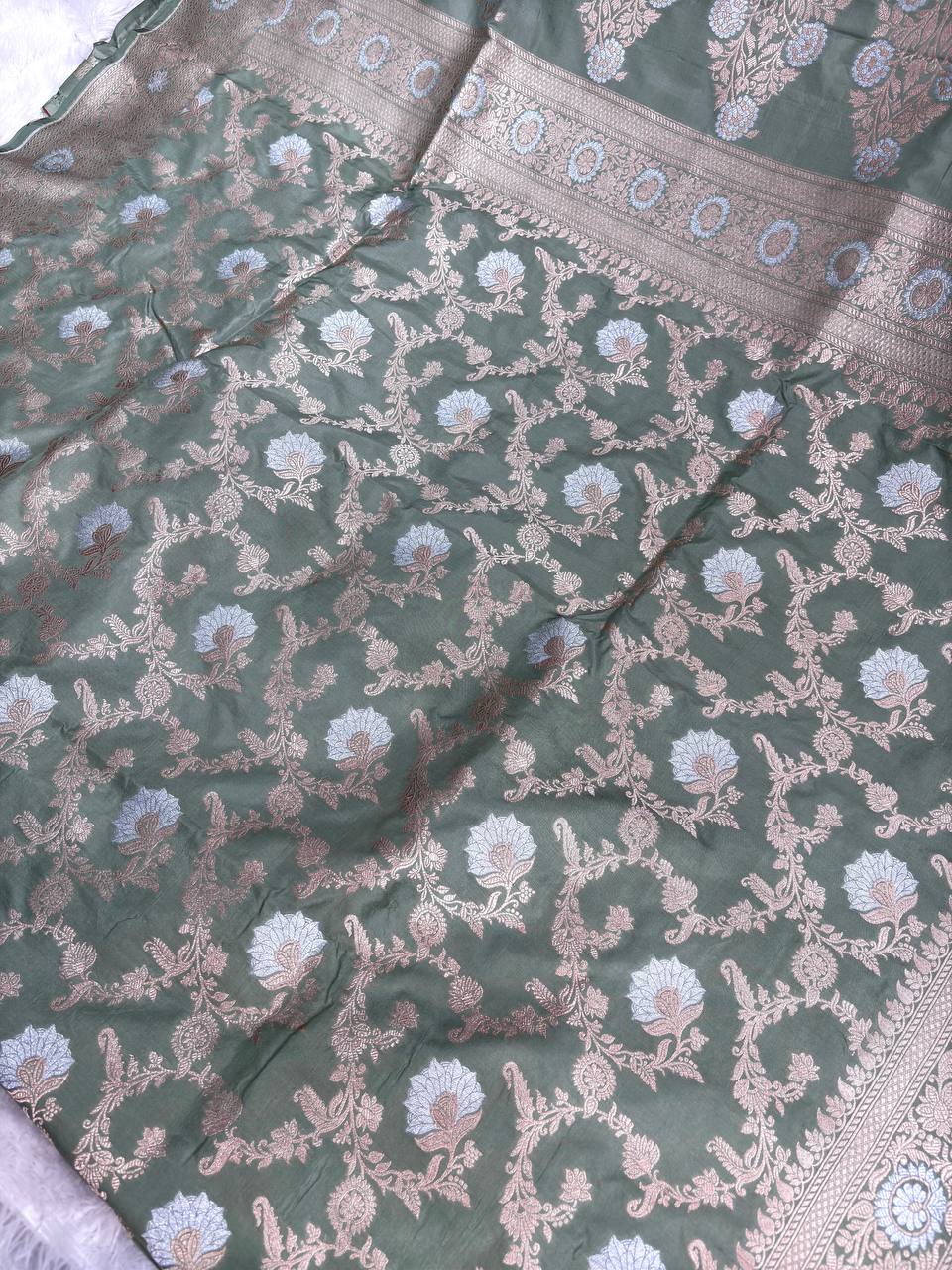 Sage Green Katan Silk Handloom Banarasi Jungla Saree with Silver Zari & Meenakari Cutwork