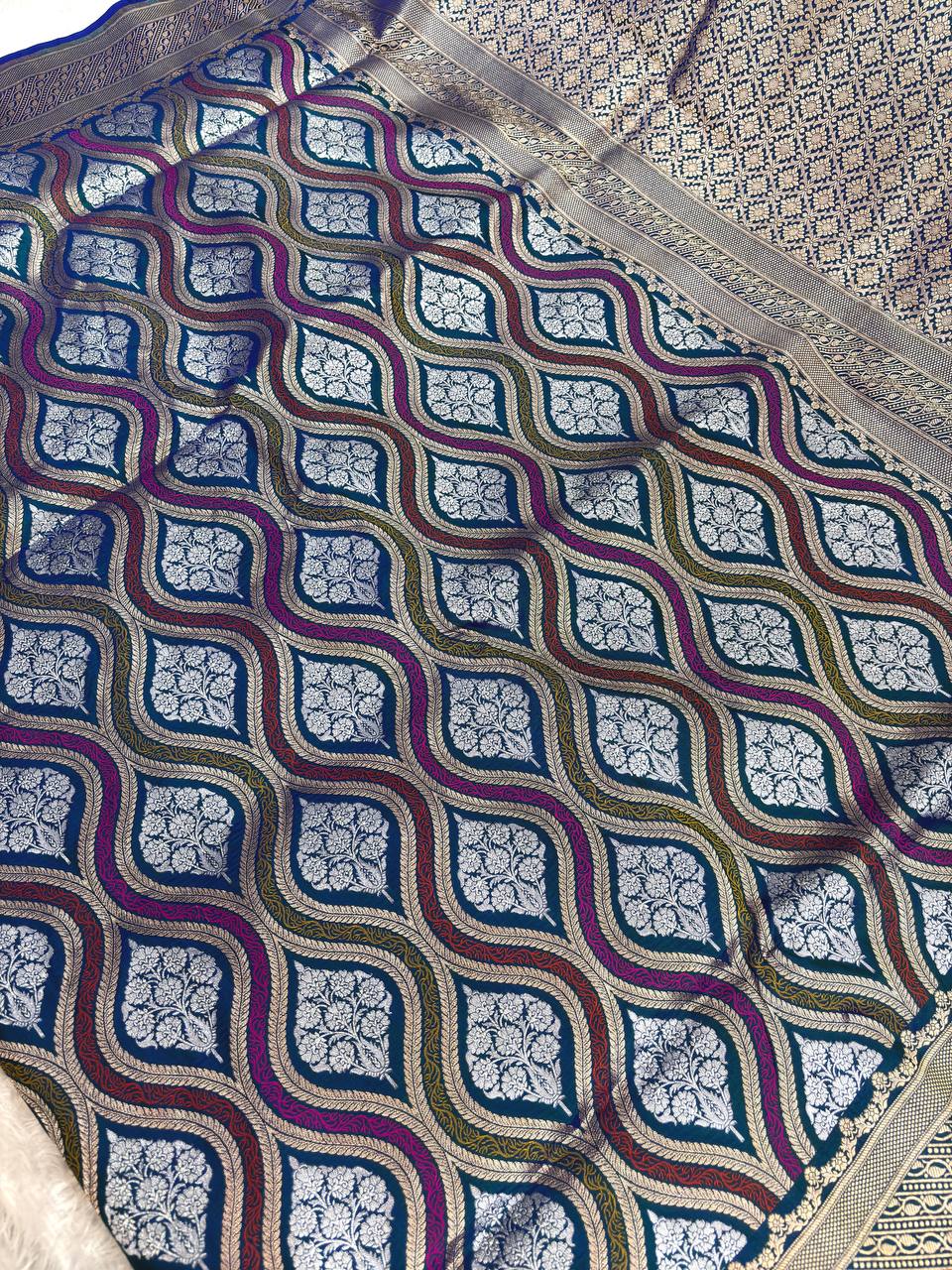Rama Teal Handwoven Banarasi Katan Silk Jungla Saree with Multicolor Meenakari Waves and Silver Zari