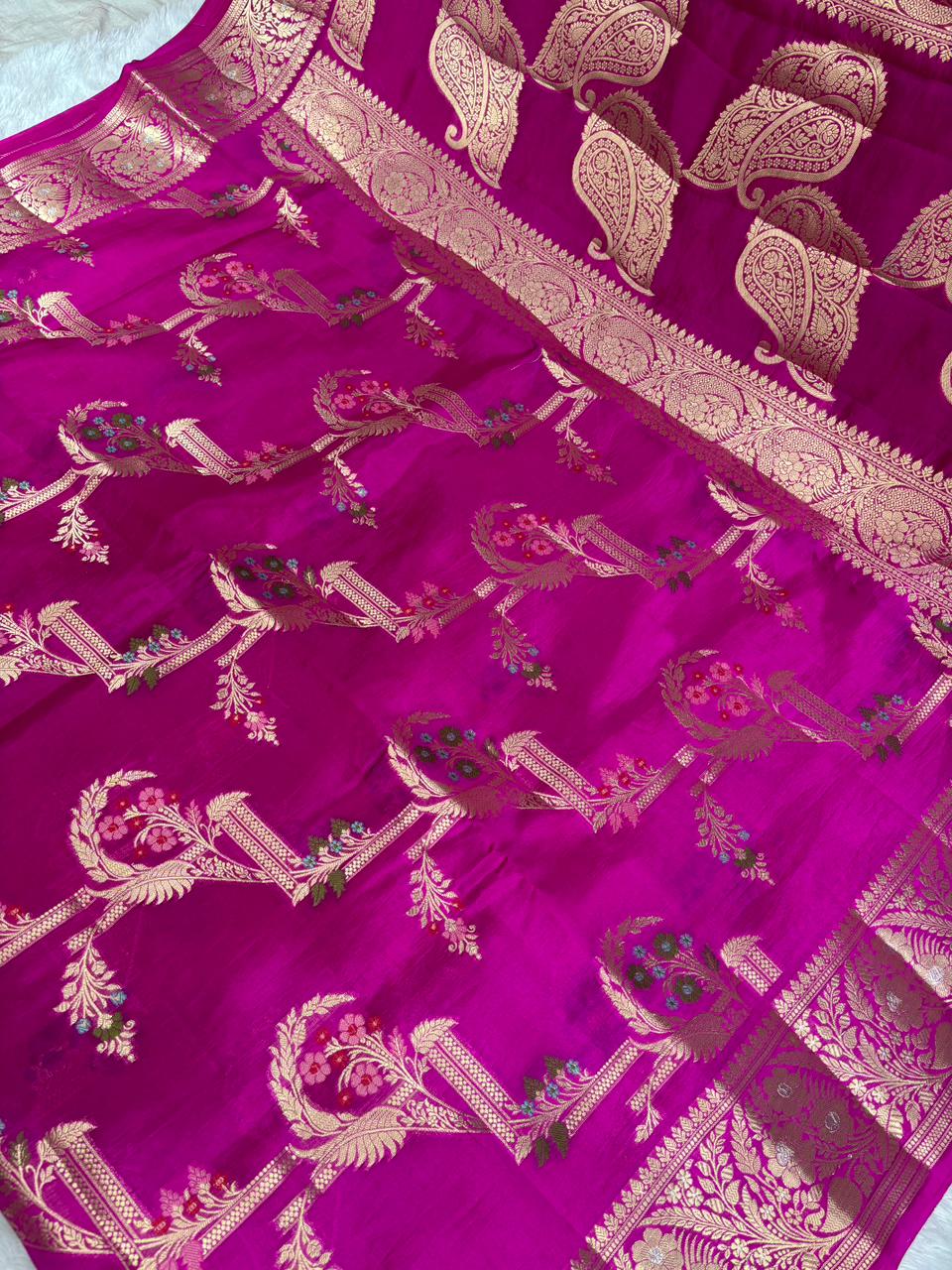 Handwoven Rani Pink Katan Silk Saree with Meenakari Cutwork & Paisleys