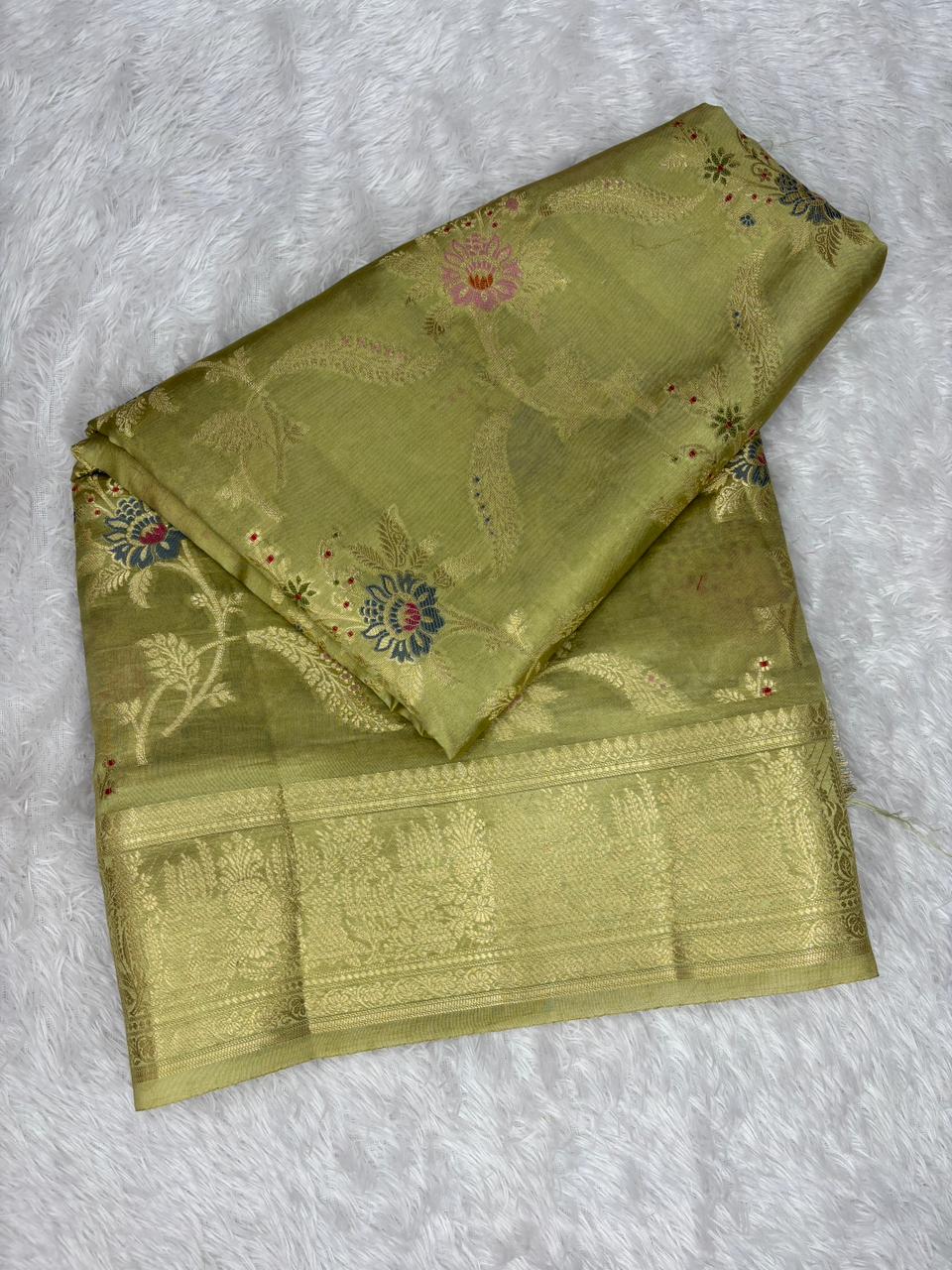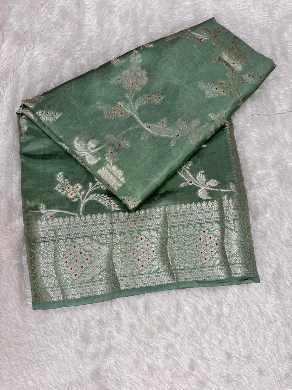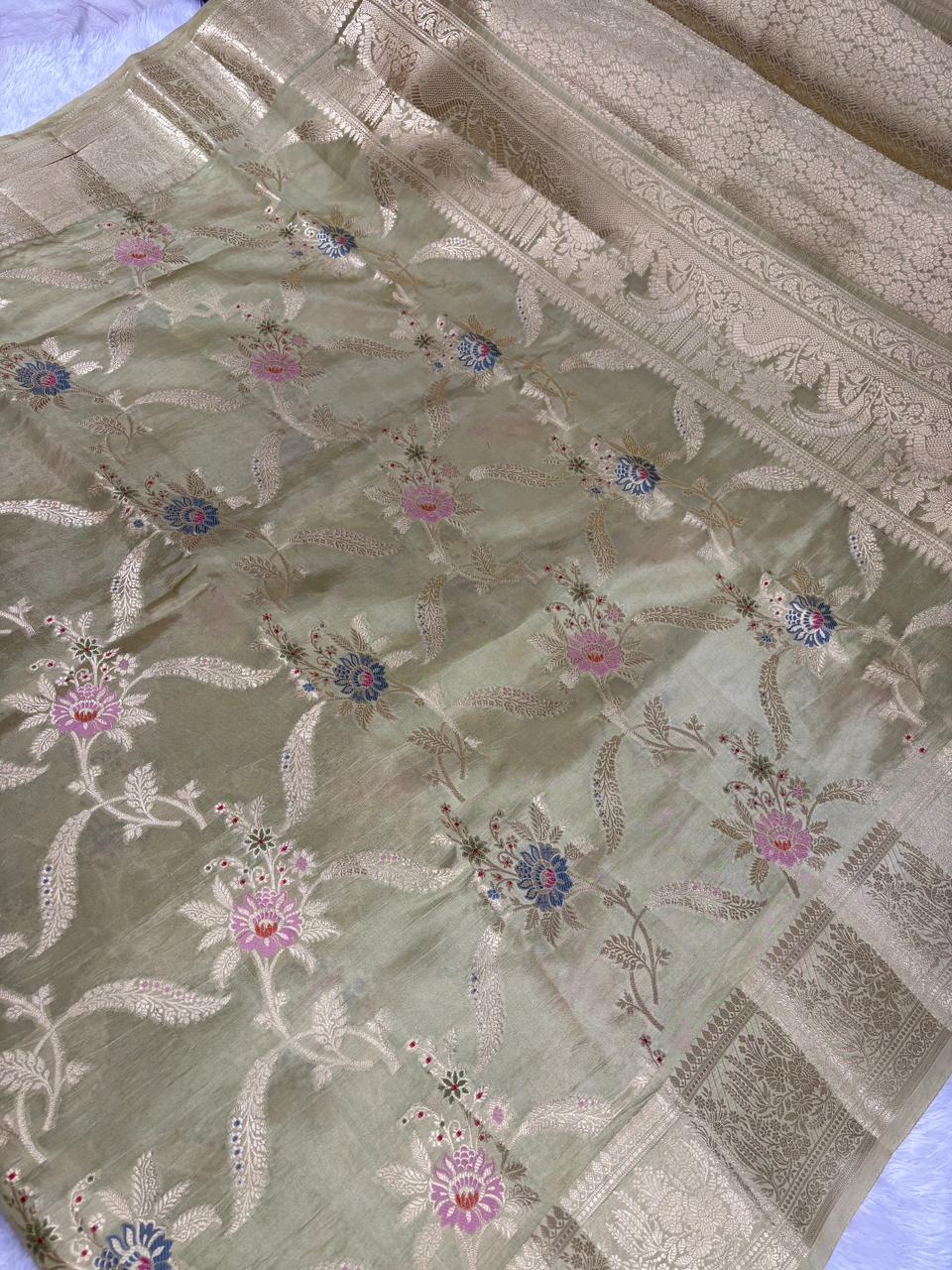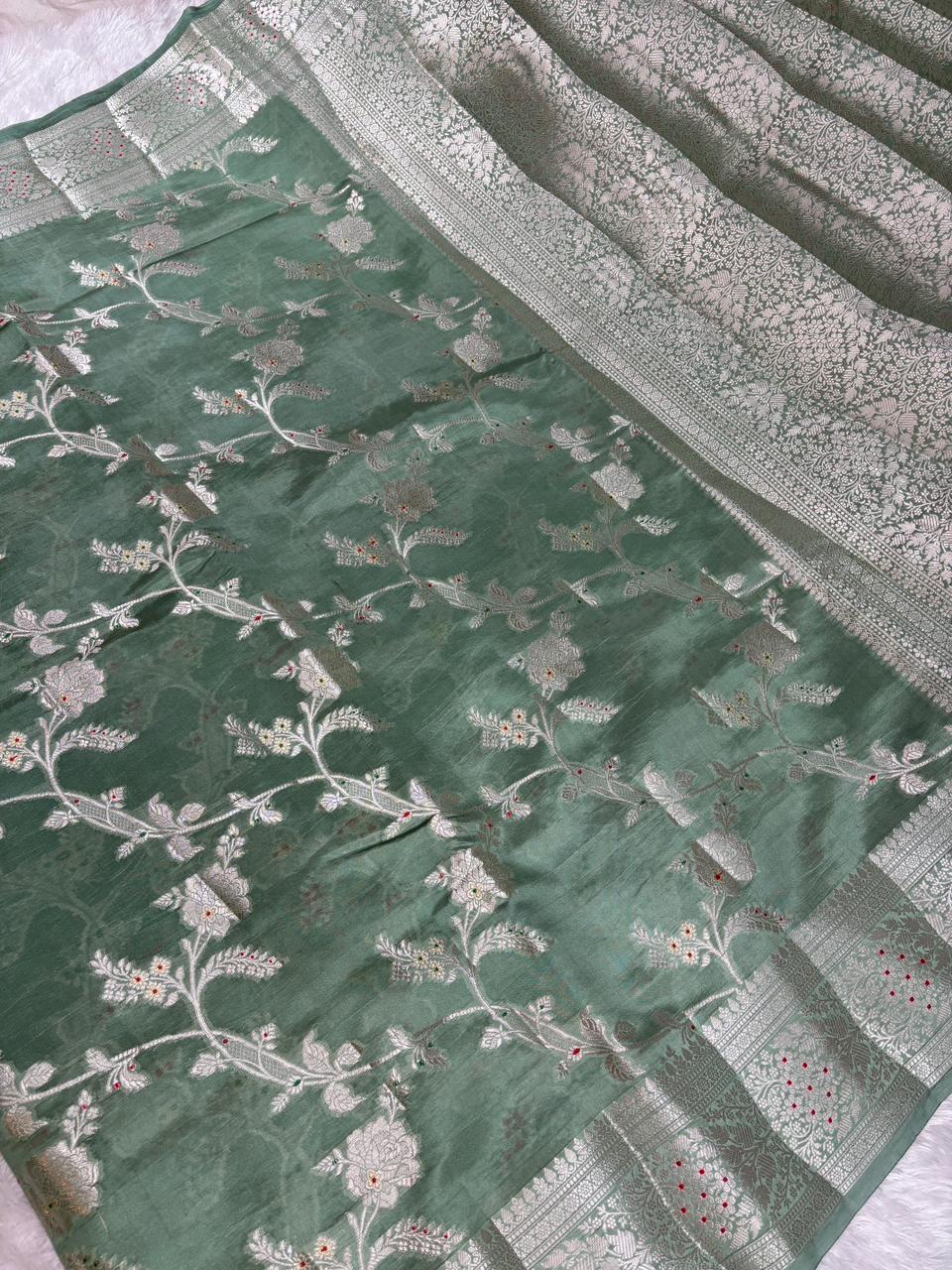 Handwoven Sage Green Katan Silk Saree with Meenakari Floral Jaal