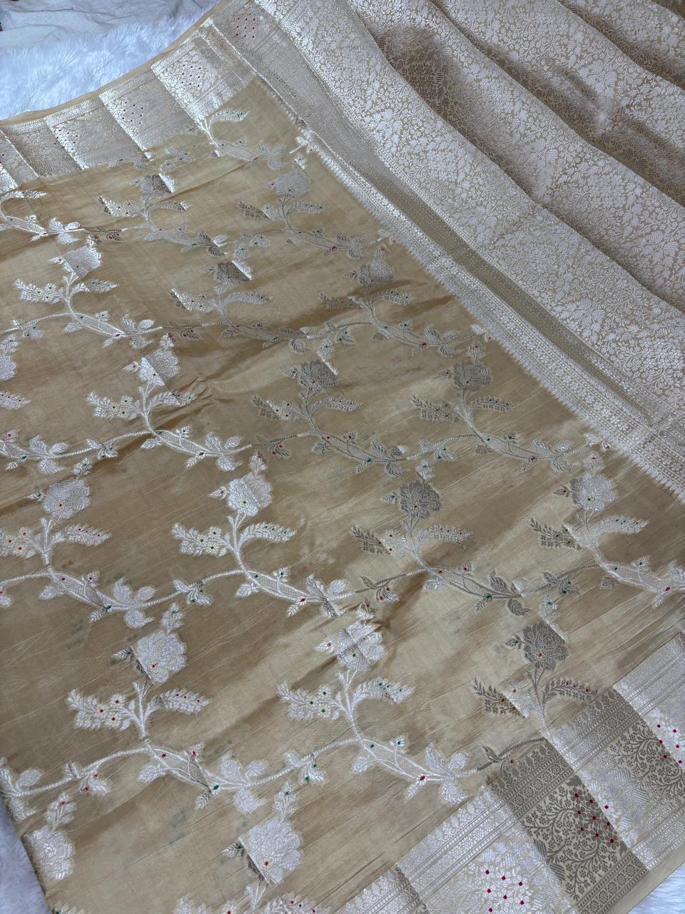 Handwoven Champagne Gold Katan Silk Saree with Meenakari Cutwork Jaal