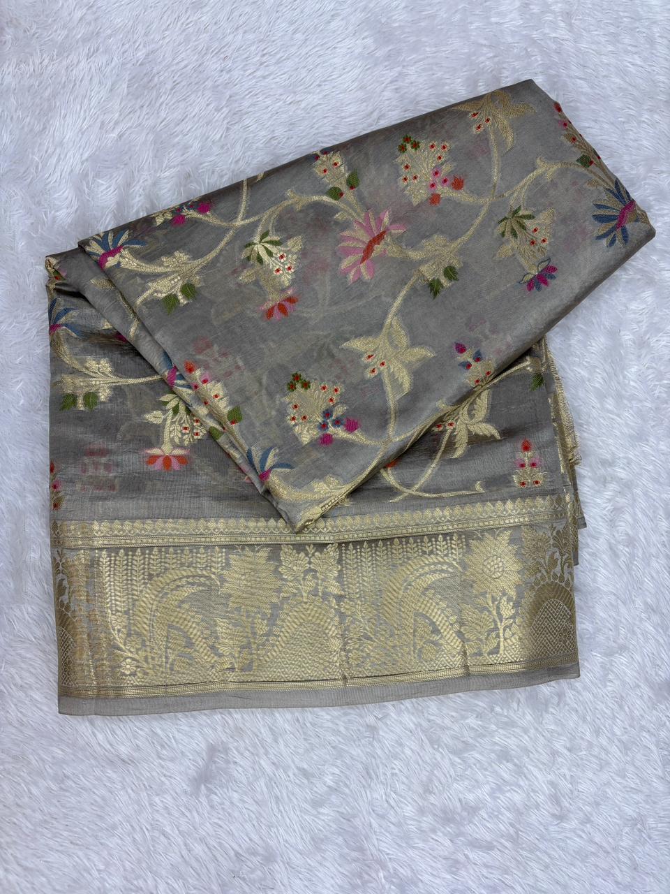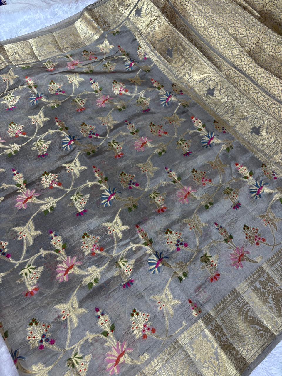 Handwoven Pewter Grey Katan Silk Saree with Gold Zari Meenakari Jaal