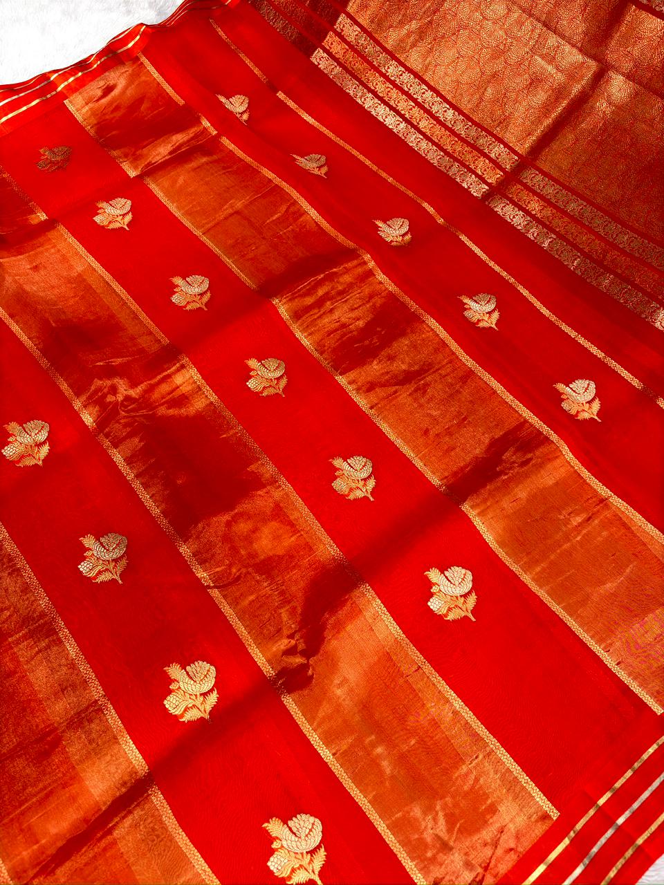 Vermillion Red Kora Designer Kadhua Handloom Saree with Gold Zari Floral Buta & Rich Pallu