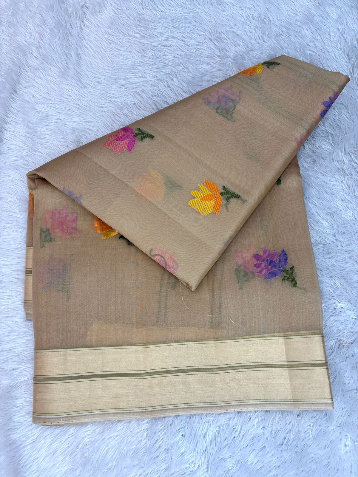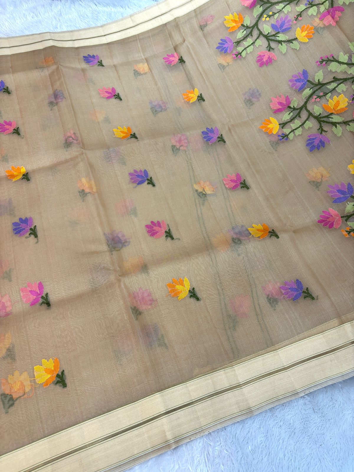 Champagne Beige Kora Silk Saree with Handwoven Meenakari Floral Vines