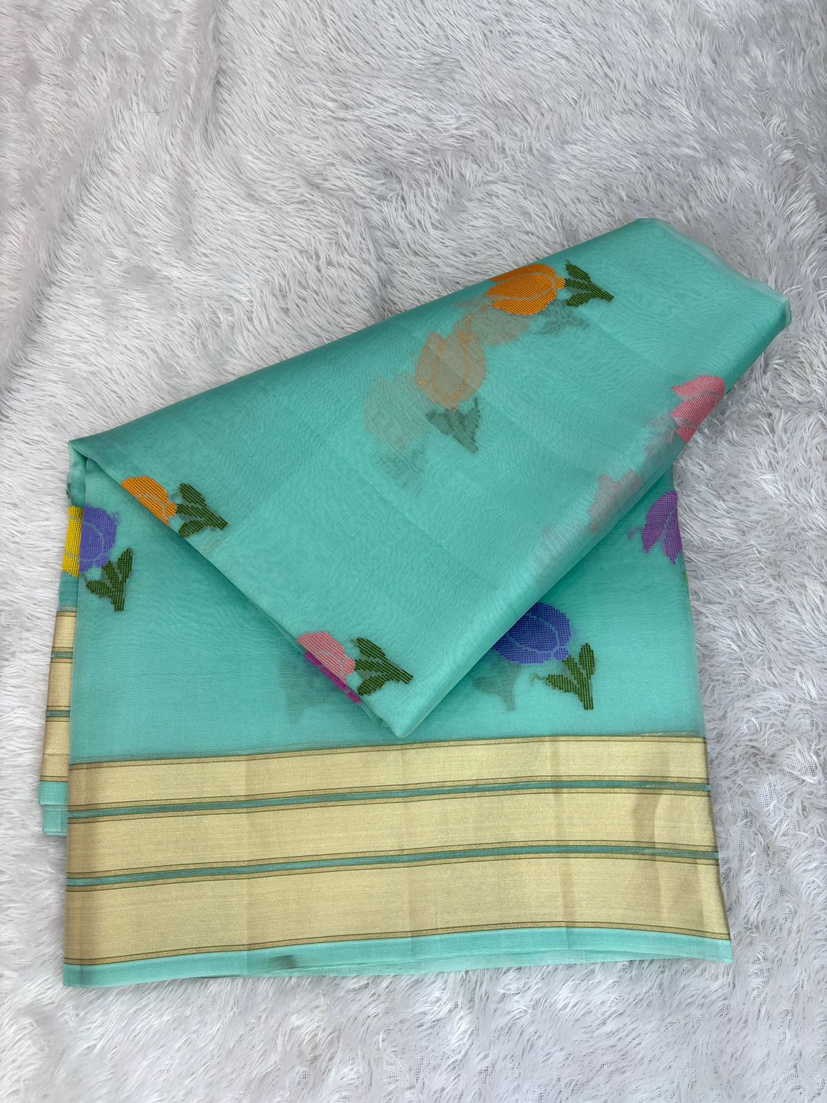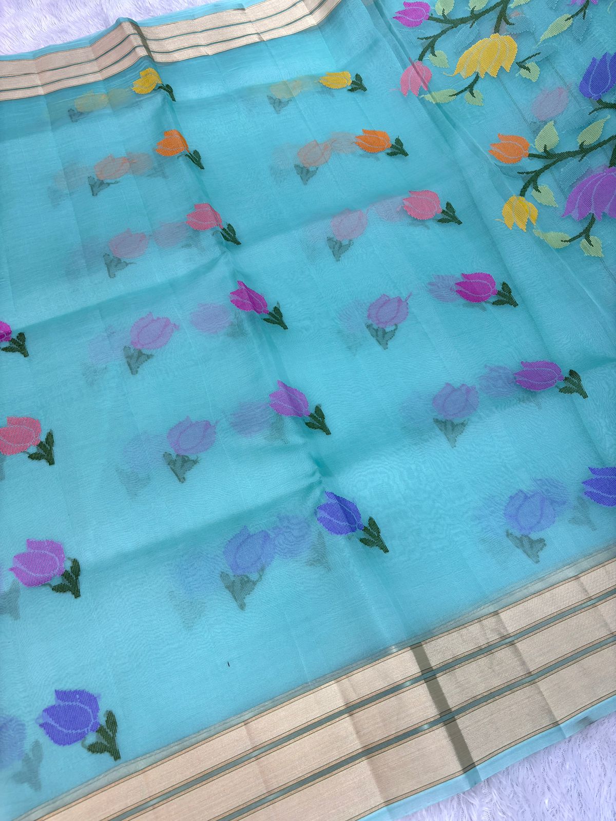 Seafoam Aqua Kora Silk Saree with Handwoven Meenakari Floral Jaal