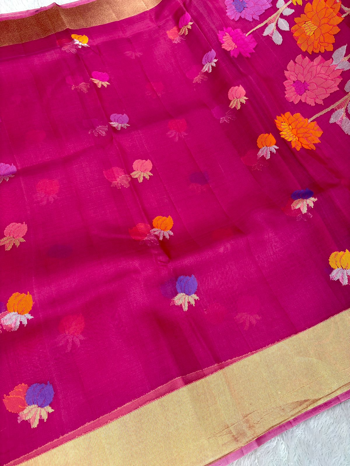 Deep Rose Pink Kora Silk Saree with Handwoven Meenakari Floral Clusters