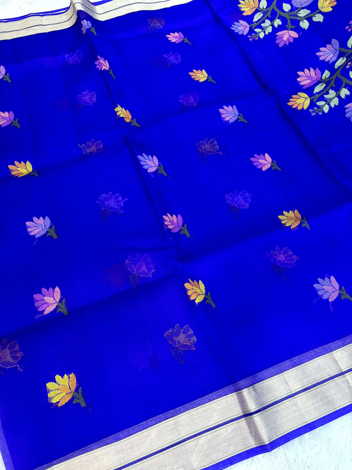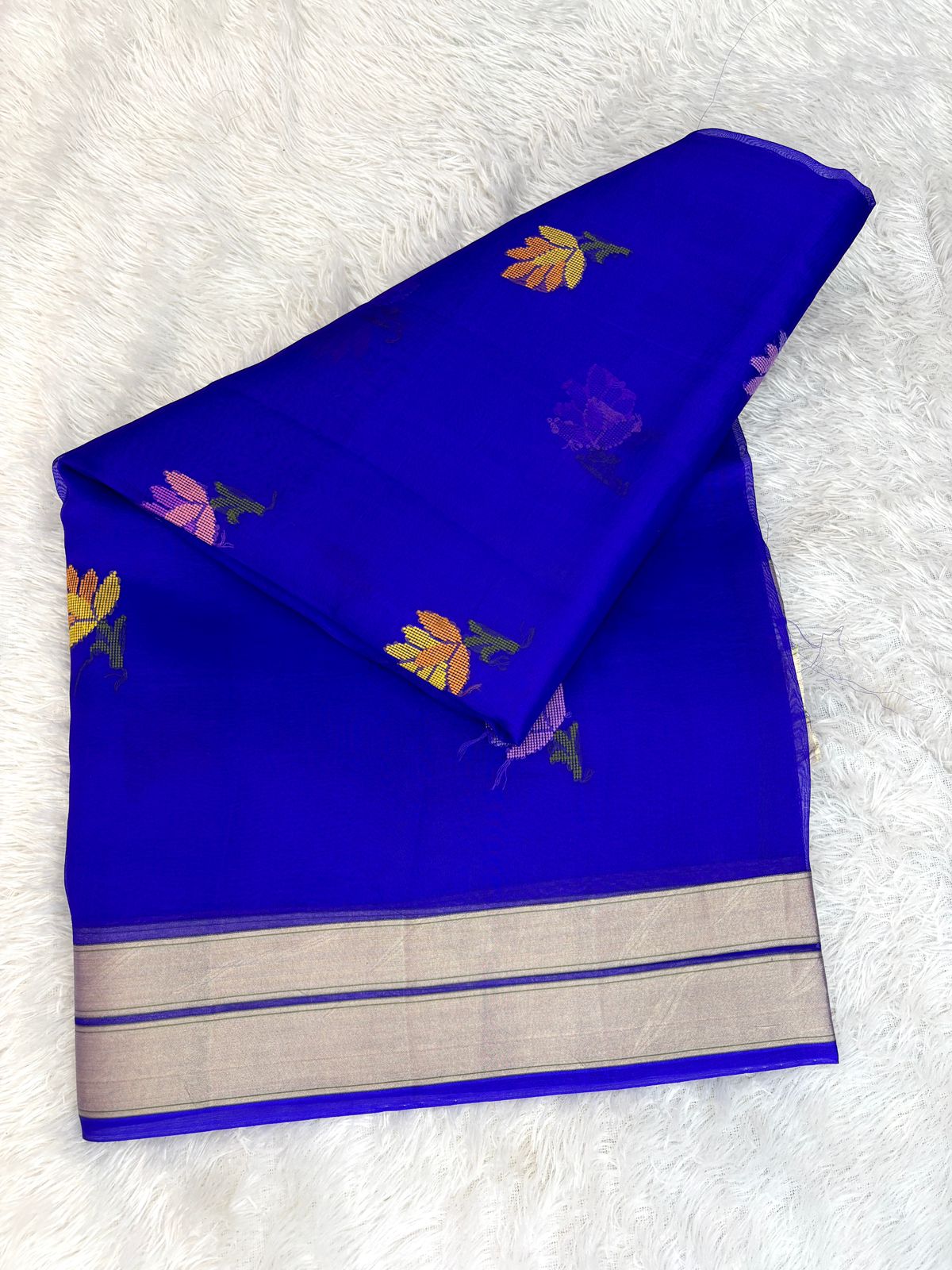 Royal Blue Kora Silk Saree with Handwoven Meenakari Floral Jaal and Striped Zari Border