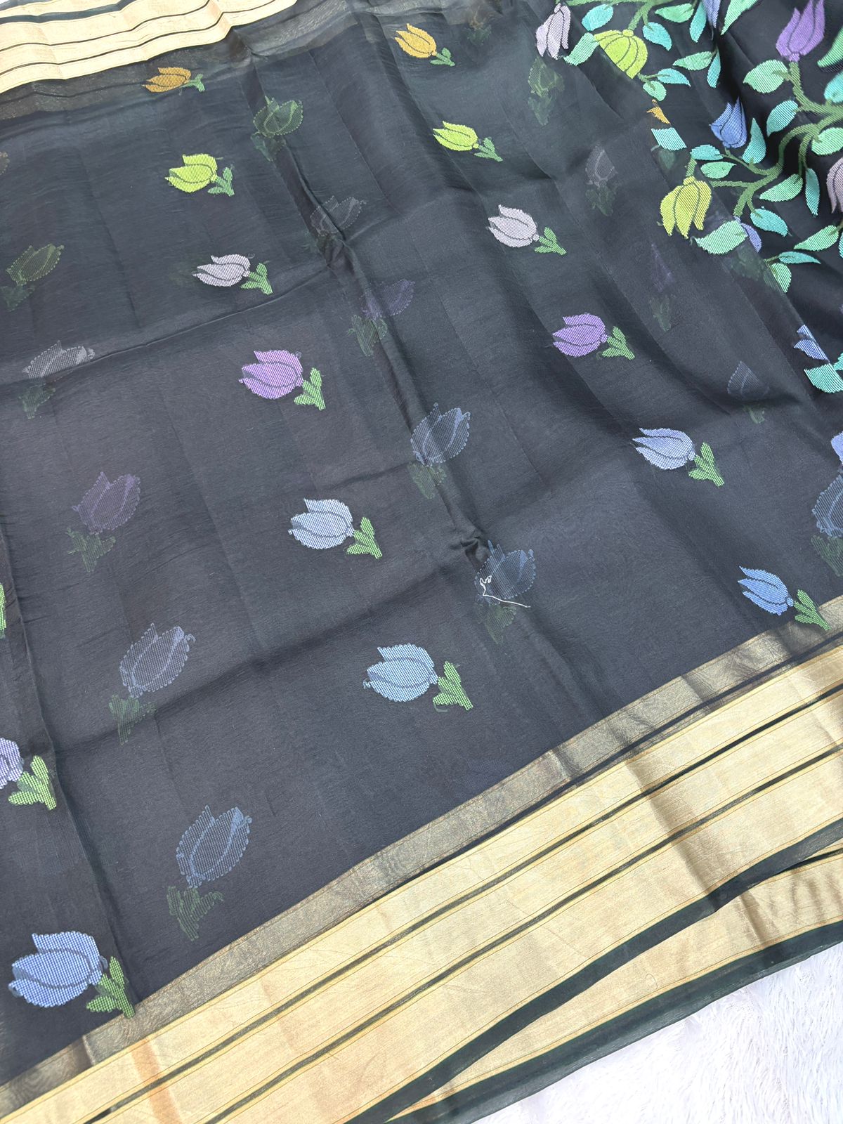 Jet Black Kora Silk Saree with Vibrant Meenakari Floral Jaal and Gold Zari Border