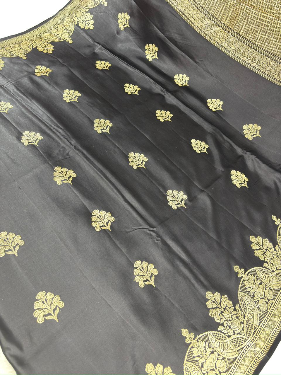 Jet Black Pure Mashru Silk Handloom Saree with Silver Zari Floral Buttas