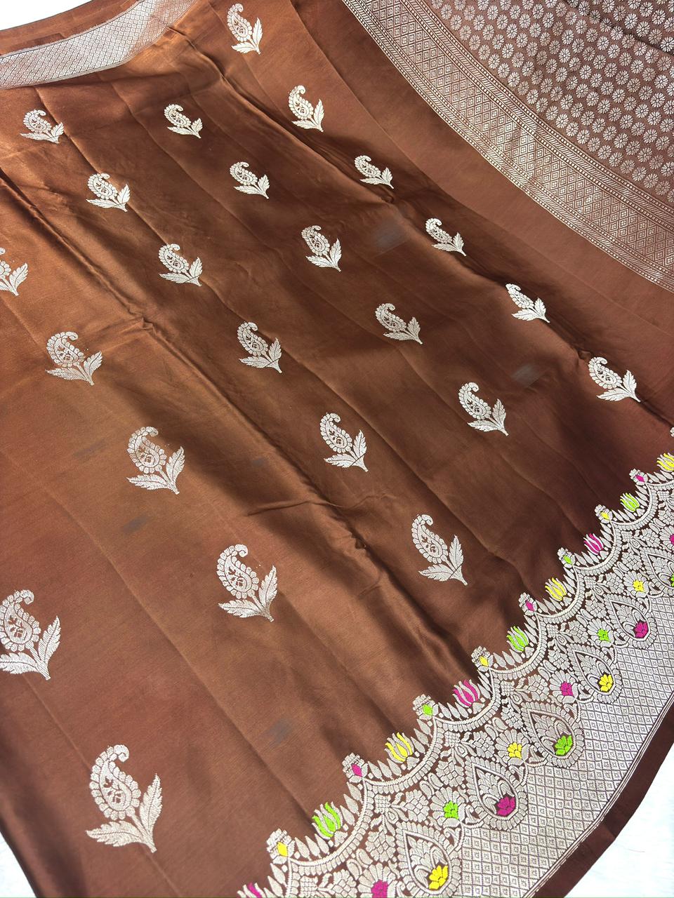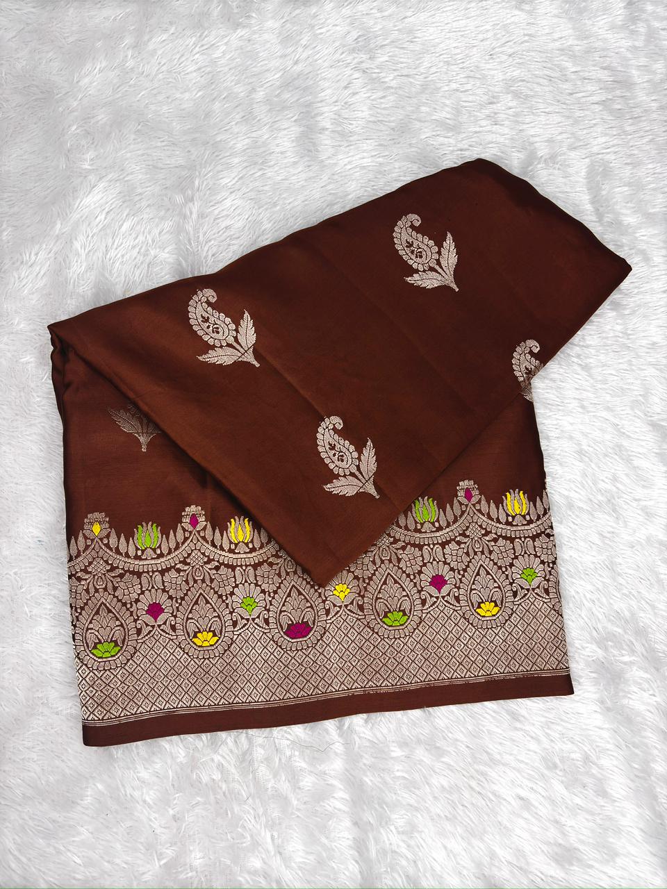 Coffee Brown Pure Mashru Silk Saree with Neon Meenakari Accents