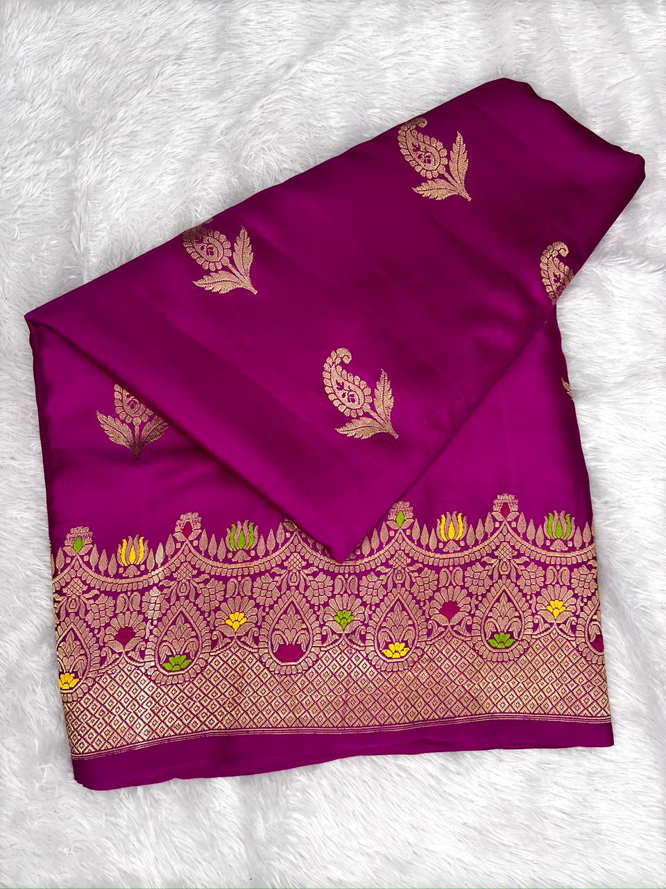 Royal Magenta Pure Mashru Silk Saree with Lime Green Meenakari Accents