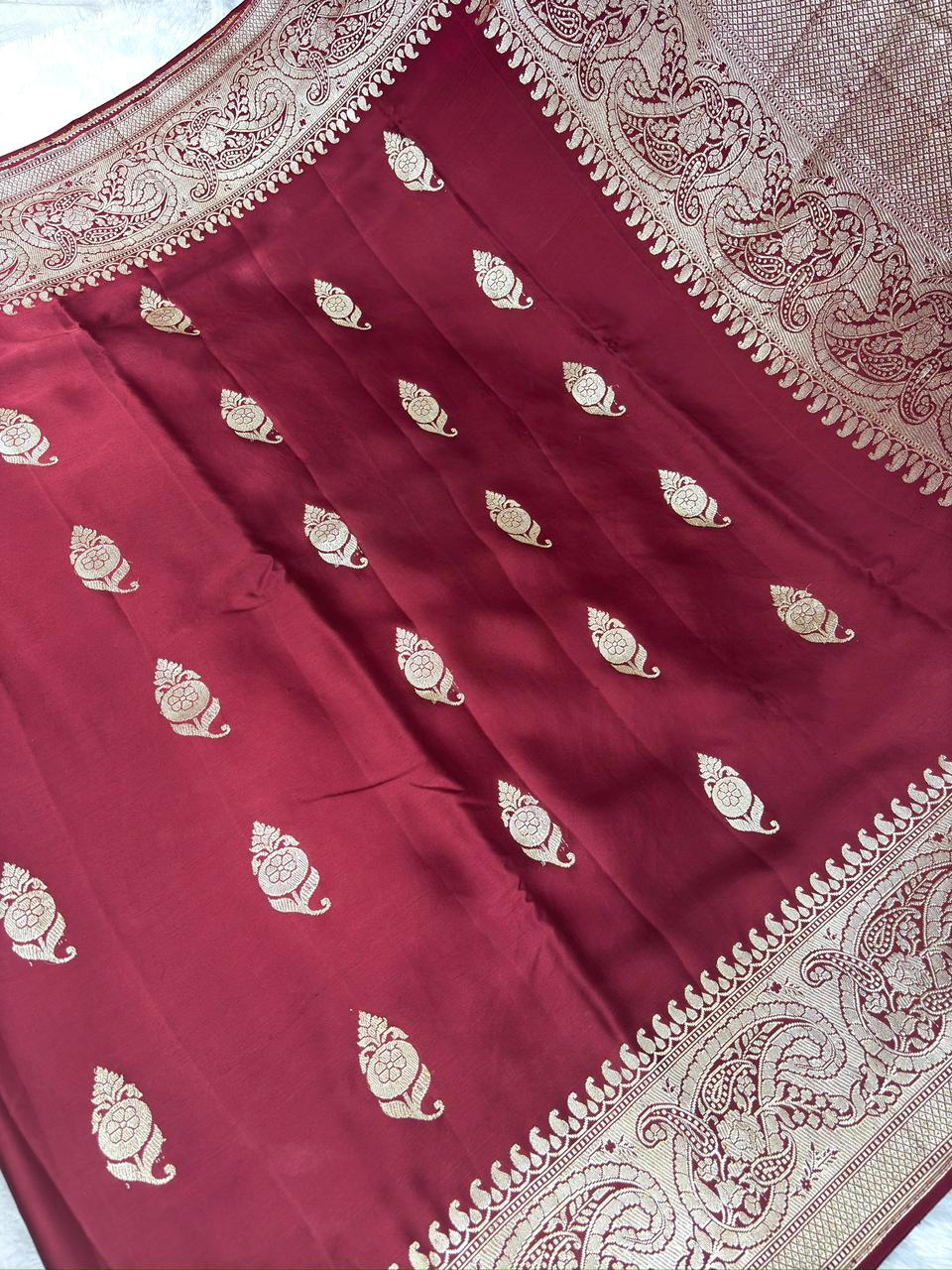Deep Maroon Pure Mashru Silk Saree with Antique Zari Floral Medallions